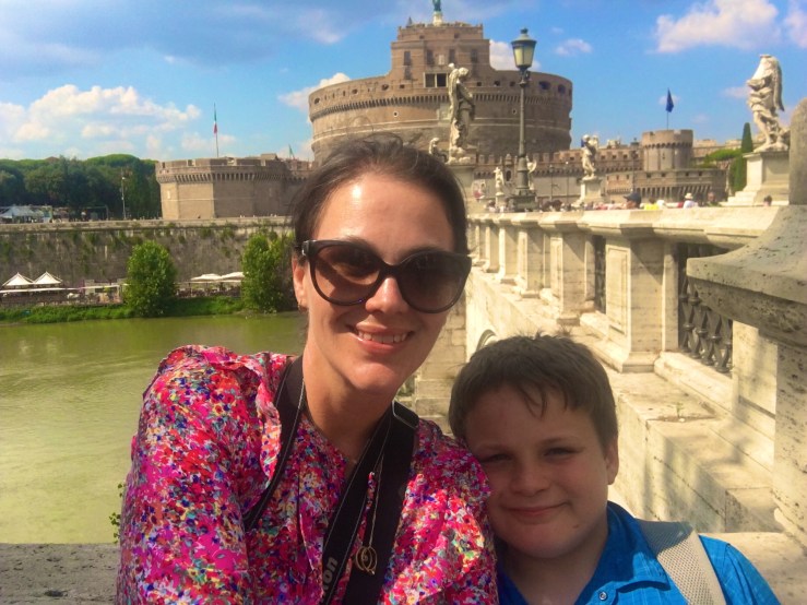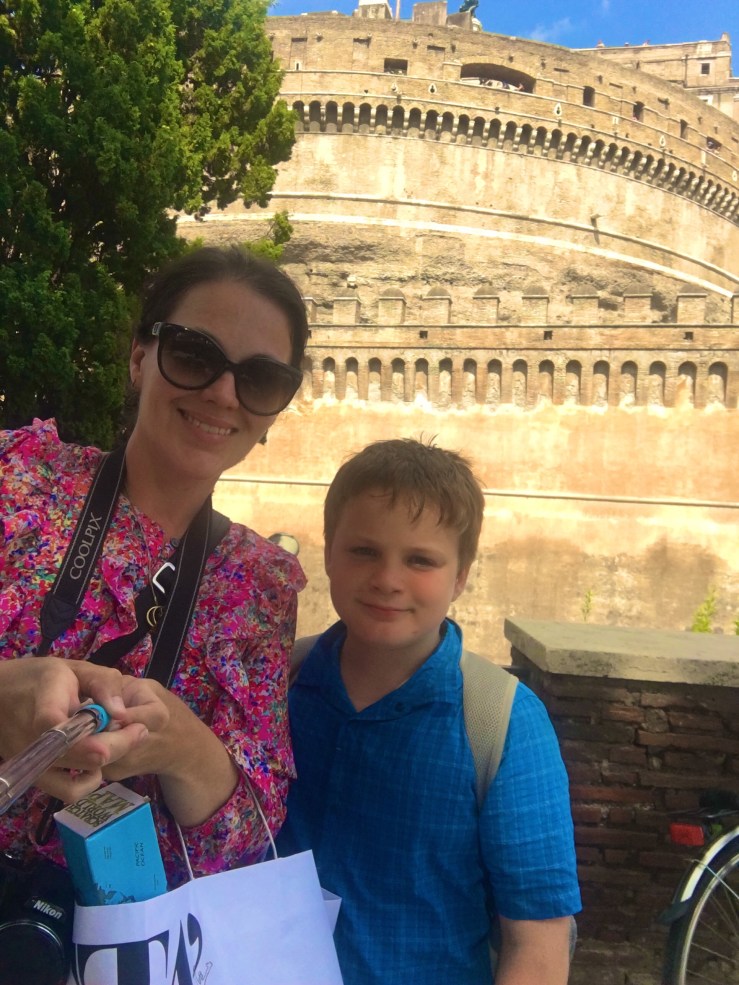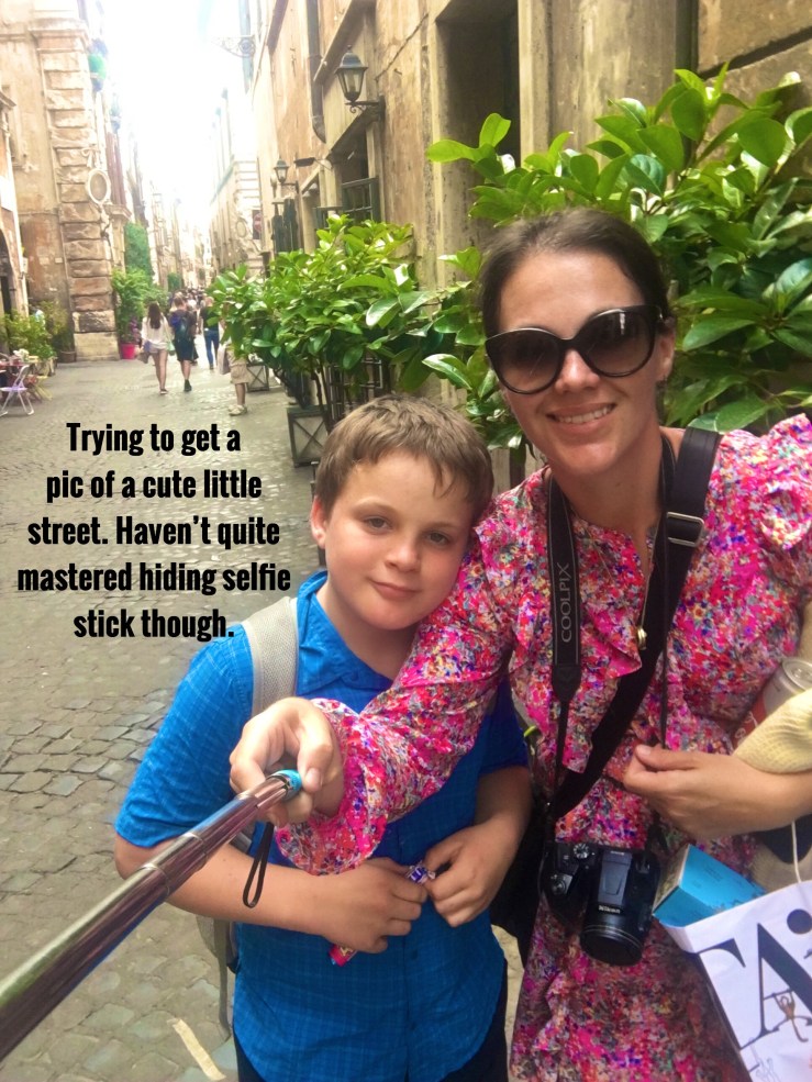 The route from Trevi to Pantheon seemed to be a popular route as we shuffled along with millions of others. Every second person was trying to sell you an umbrella, bottle of water or worse still – slap a bracelet on you (that you can’t get off) and then demand payment. In Australia it is illegal to sell things in a public place without a permit. I sure wish Paris and Italy would adopt this policy. Rohan was terrified as he had been warned by so many people about scammers. One man holding bracelets tried to shake Rohan’s hand and he immediately shook his head and clung to me. The man said “Hey! What’s wrong? You don’t like black people?” Which horrified Rohan as he loves people of any colour. I was very annoyed at the man and then the kids and I watched in fascination as another man had a similar encounter with another boy. He did this kind of handshake with the boy then demanded payment for the bracelet. I could see the father trying to get the bracelets off the boy and his brother, who had also fallen prey, and despite Kylah’s hope that a fight would erupt, the boy’s father eventually handed over money and went on his way. Seems easier not to fight it.