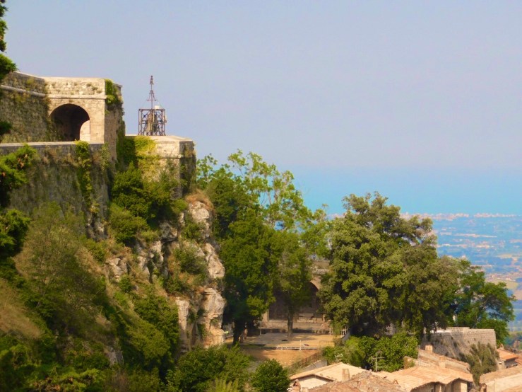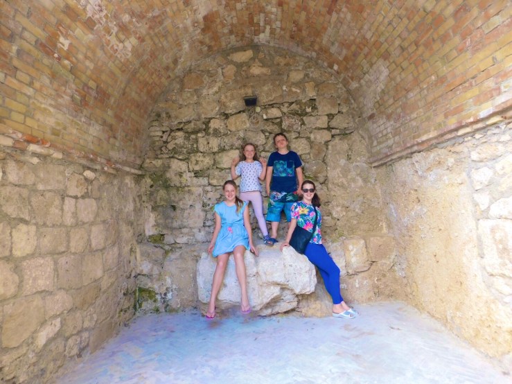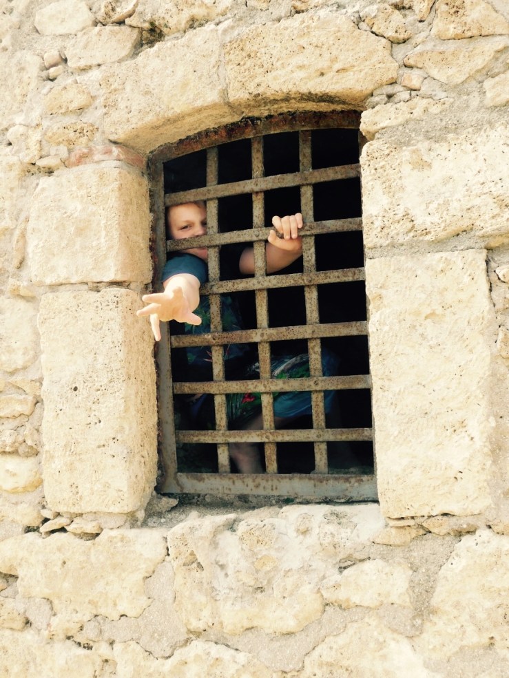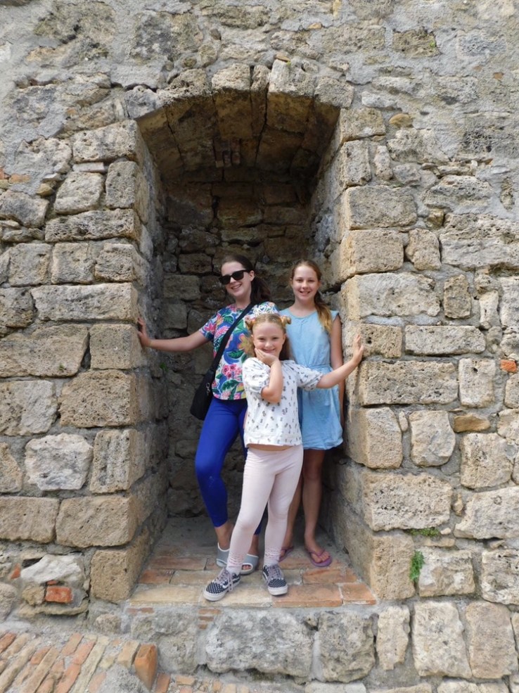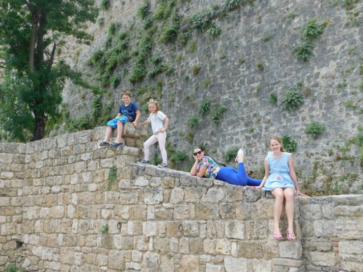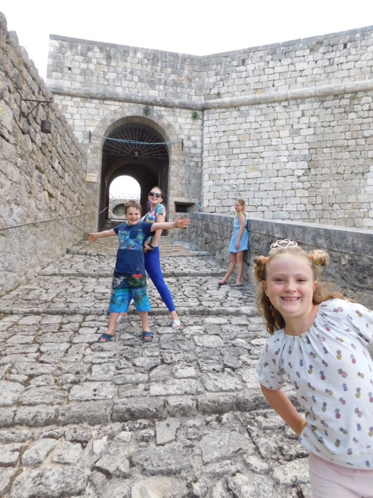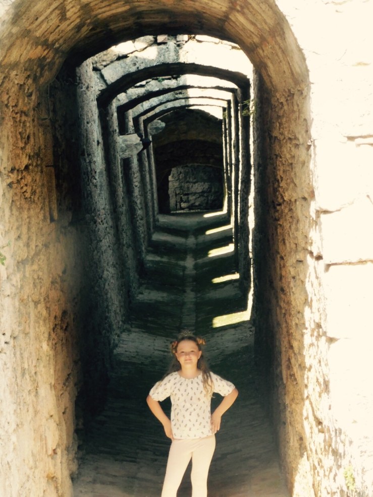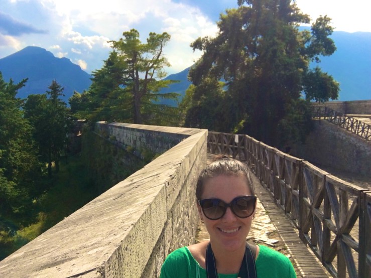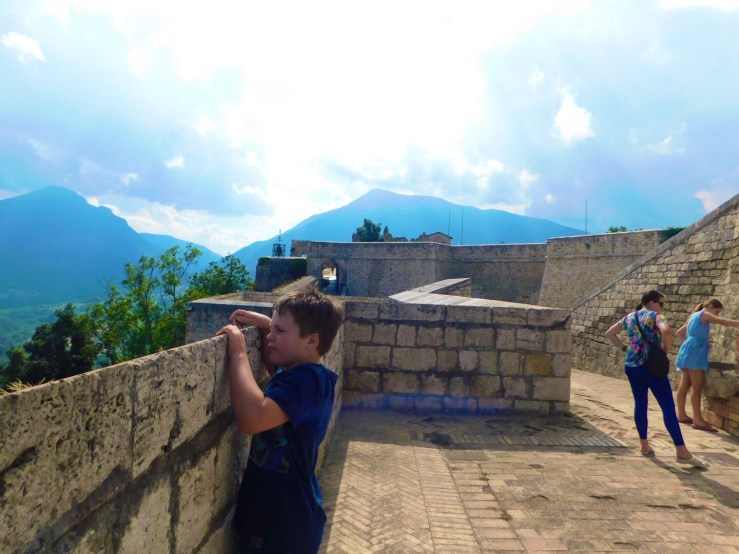 The fort itself is easily accessible and fairly cheap to visit. For a family of 6 it only cost €19 and that included €3 for a guide that told you all about the history and what were viewing. We began walking around with me reading from the guide to Ben and the children “this fortress is one of the largest and most important works of military engineering in Europe” I began. That was as far as I got before most children disappeared except for Isabelle who was scouting around for a toilet. The guide didn’t give an exact age of the fortress and kind of detailed battles and sieges, that it was a part of instead (including one with Napoleon). I couldn’t figure out if it was always occupied by Italians of at some stages occupied by the French. A quick Wikipedia search told me that yes it at some points had been occupied by the French and that the exact age of the fort is unknown. There is evidence of human occupation in the area as early as the Neolithic and Palaeolithic ages. The fortress itself first emerges in texts and is described as a “walled town” in the 10th and 11th centuries.