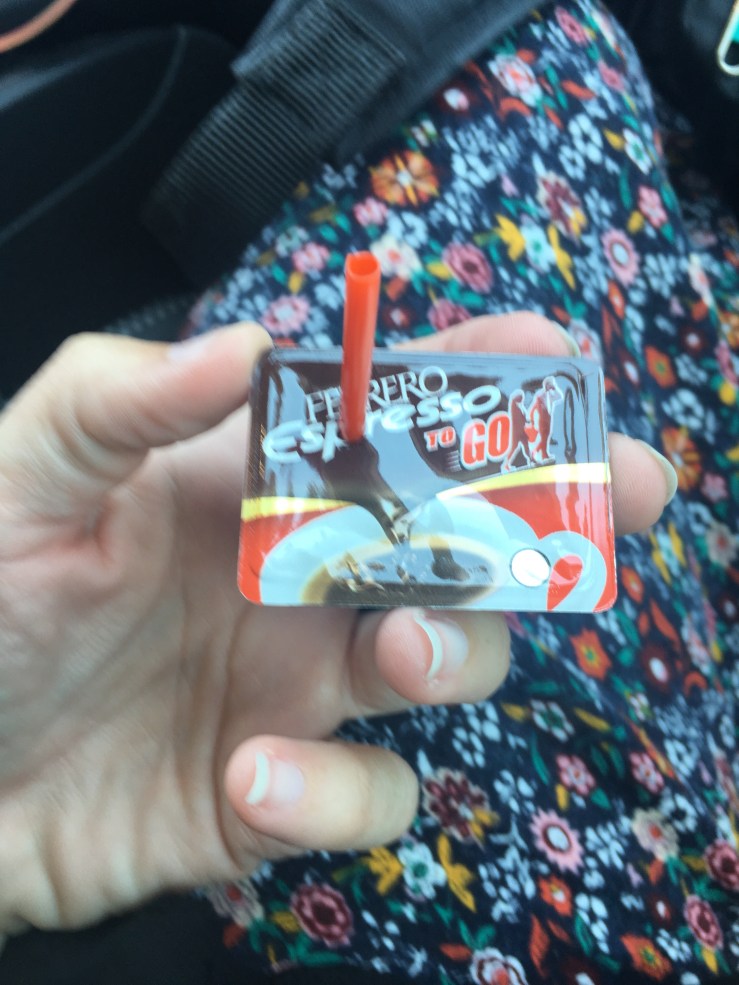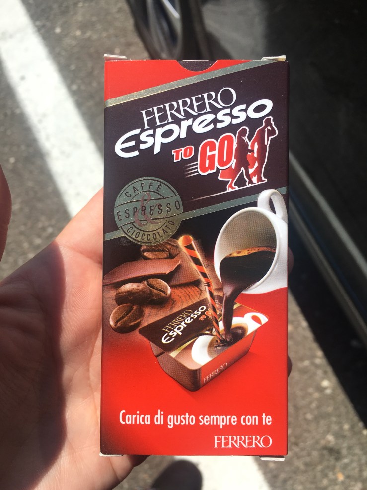 I’ve decided to employ the same strategy on myself and have stumbled across a product in Italy called “Ferrero Espresso to Go”. I purchased some and am pleased to announce that they are delightful and I LOVE them. It is a little capsule that you poke a tiny straw in and it is a shot of coffee in liquid dark chocolate. I am so excited!!! Hopefully I can find some more on this trip to bring home. If I get used to the coffee flavour in them then I might be able to ween myself off the dark chocolate part. For those of you who are thinking “why doesn’t she just drink Mochachino’s?” the answer is simple. I’m not a fan of milk or milky things although I am not opposed to milk products such as cheese, chocolate and ice-cream.