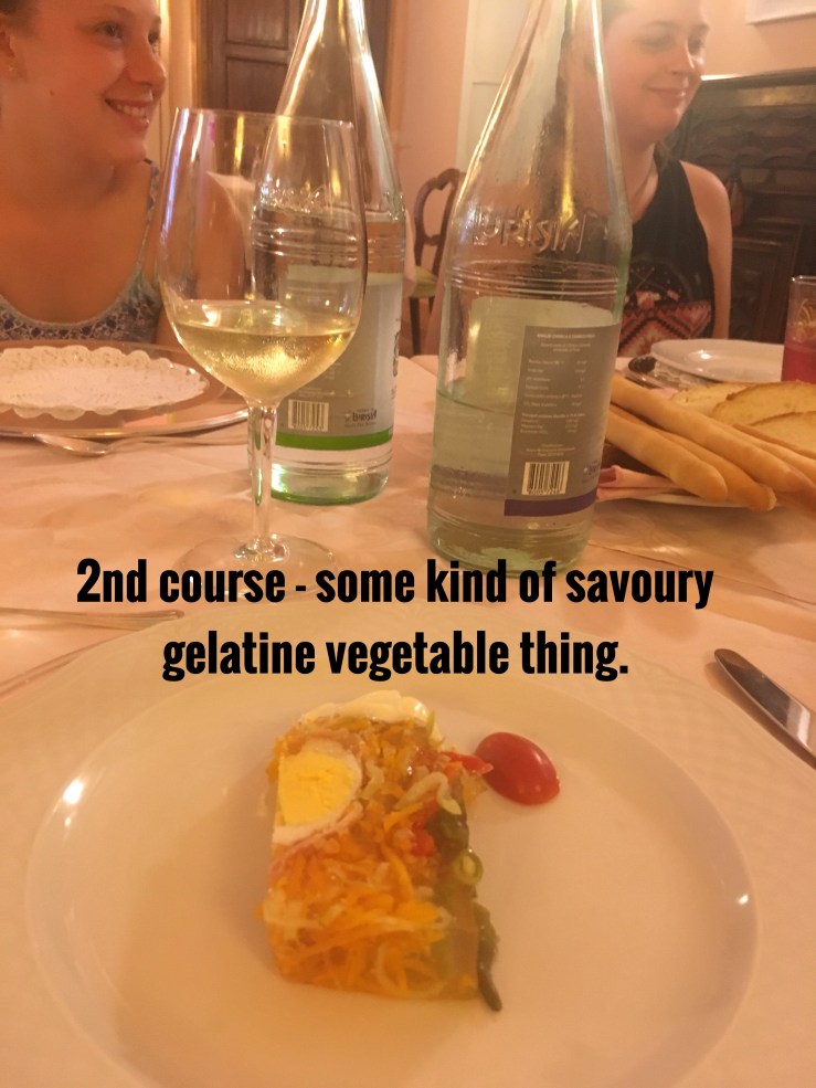 Francesco bought out our first course, which was some kind of cured meat with something that looked a little bit like mayonnaise but fancier. It was quite nice. We were also given a whole heap of different types of breads. After we had finished he whipped around with the second course, which had the children wide-eyed and terrified. We had told them they had to eat EVERYTHING they were served and say that it was “Bellissimo!!!!” even if it was dog shit dipped in sprinkles. The second course may as well been dog poo dipped in sprinkles as far as Kylah and Isabelle were concerned. I don’t even know how to describe this dish. It’s nothing I’ve ever experienced before.
