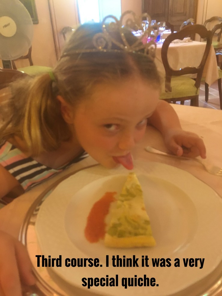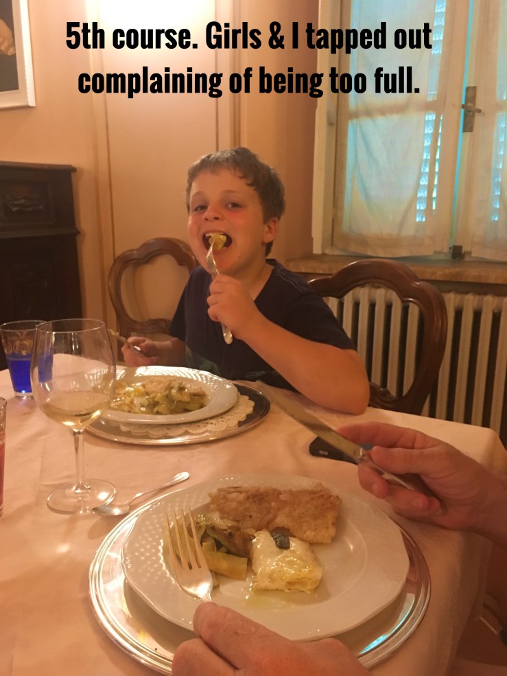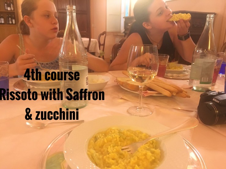 Third course made Rohan’s eyes widen and a look of horror filled his face. It was a very, very cheesy piece of some kind of quiche or pie with asparagus in it. To his credit, he ate most of it and tried to do his best thumbs up sign when Francesco asked how we liked it. I told Francesco not to bring 4th course for Isabelle because she was already full. This was the one course everyone loved. Saffron risotto with zucchini. By this stage all the girls were stuffed and declined the next course which was some kind of meat (pork or chicken) which had been “cooked” in vinegar. Not actually bought up to the temperature required for cooking meat, but just soaked in vinegar for goodness knows how long. Also on the plate was an egg and eggplant “cooked” in a similar manner.