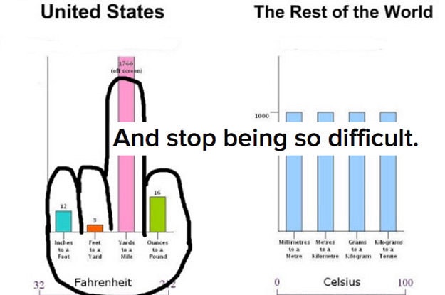 I suspect there may be a correlation between Imperial supporters and pro gun people. People who are so desperate to hang on to a past, no matter how ridiculous or irrelevant to modern life it is. My quest to learn about the Imperial system sent me down a rabbit hole of memes about it. I then switched to gun advocate memes and was astounded by how little sense they made. Here are a few of my favourite Imperial memes and a link to a website that features a bill Alexander Graham Bell tried to pass over a hundred years ago!!