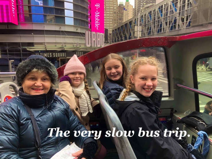 Not wanting to waste a day we trudged on to the ‘Hop on hop off” bus as we had a pass as part of our package. I was NOT a fan. We did one small circuit of uptown NYC, I estimate that the circuit is no longer than 10km at the absolute MOST. No idea how many miles that is. But it took TWO HOURS!!! Kylah and I sat down the bottom of the bus and were absolutely FREEZING. Mum and the other girls bravely sat up top to enjoy the views. During the loooonng two hours it began sleeting!!! SLEETING!! That is literally the worst thing ever. Ice chips spitting down on you from up above and then melting slowly on your frozen skin. At least snow is dry and doesn’t make you wet (or so Ben informed me).